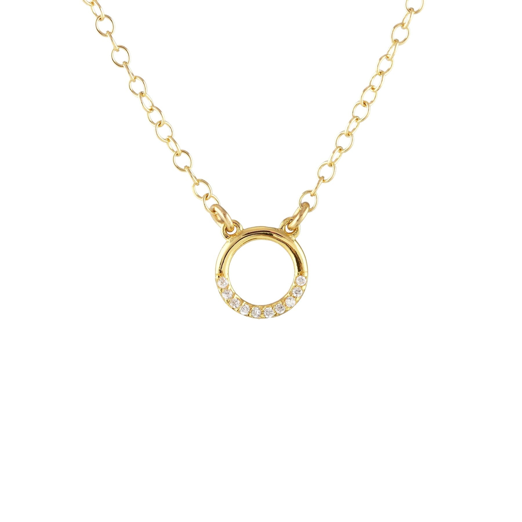 Circle charm in a pave setting with cubic zirconia crystals. Charm measures 9mm diameter. Gold-filled chain. Adjustable length 16-18 inches