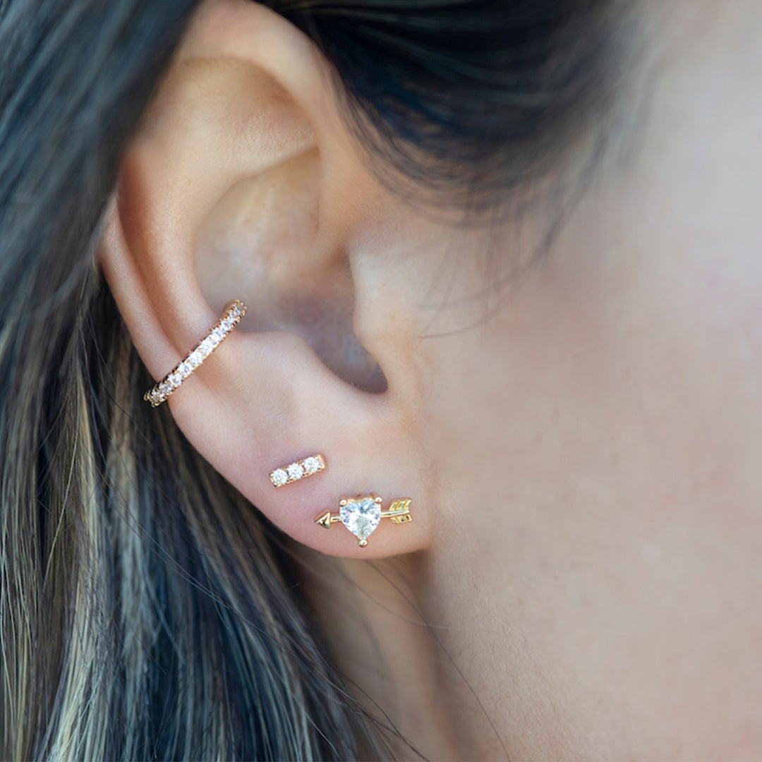 Heart shaped cubic zirconia crystal with arrow. Heart measures 5mm. Overall size of stud earring is 10mm. Available in 18K gold vermeil (solid sterling silver with 18K gold plating).