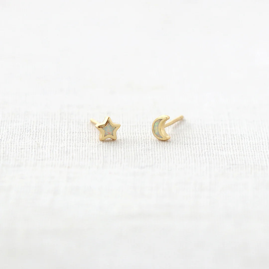 A match made in the cosmos. This mismatched pair features one shimmering opal star and one glowing opal moon—both crafted in 18K gold vermeil for a dreamy, celestial vibe. At 4mm each, these studs are small but full of sparkle. Wear them solo or mix into your ear stack for a little lunar magic.