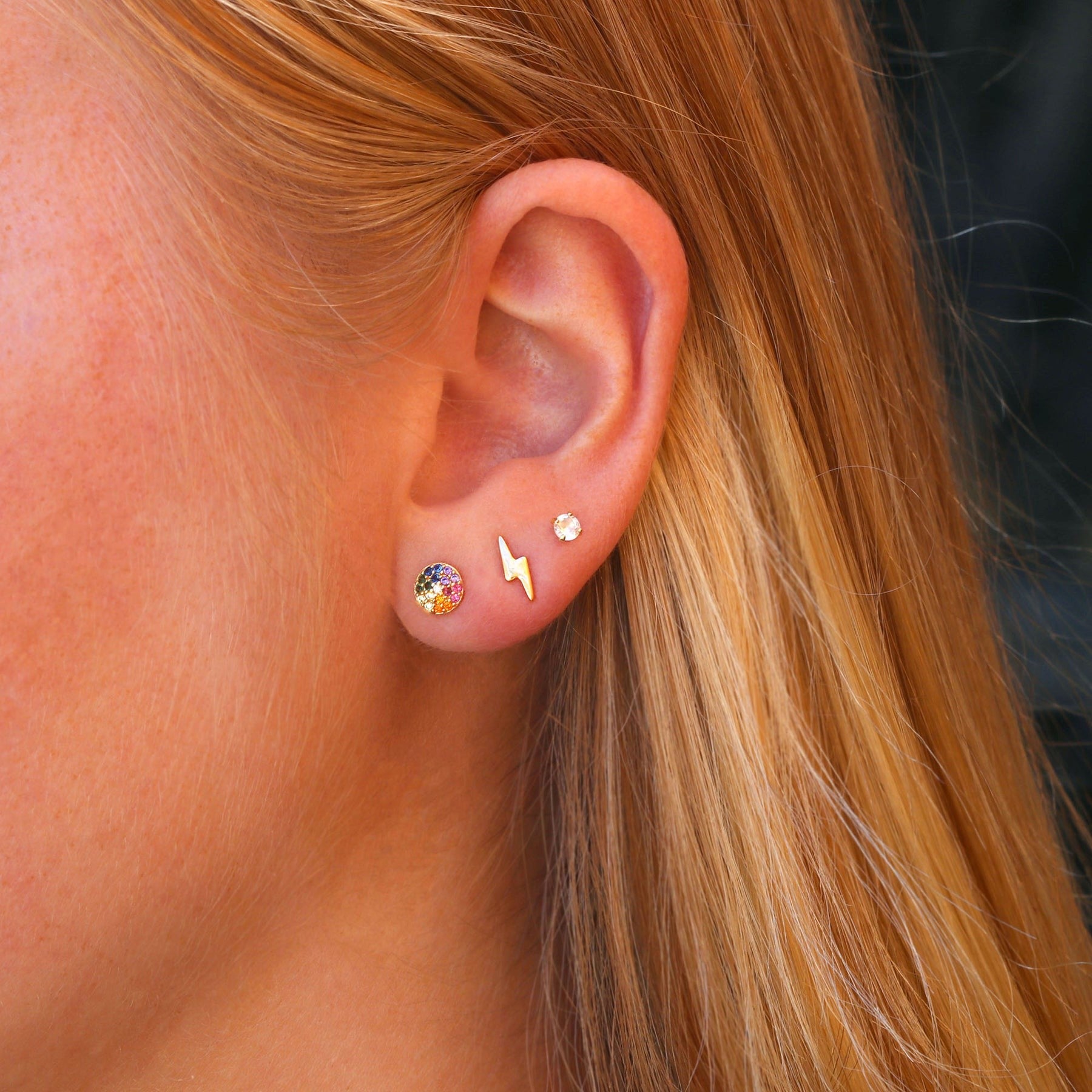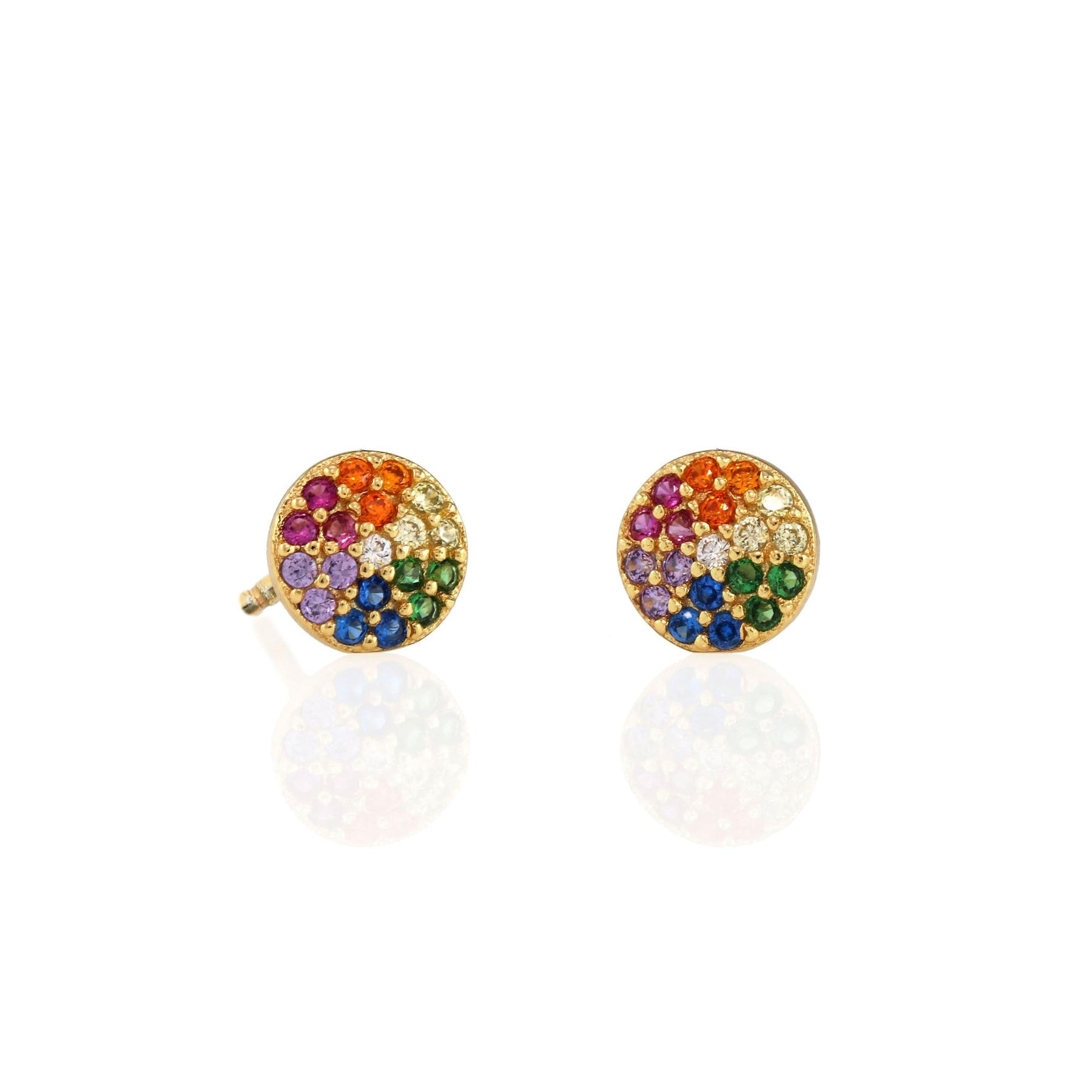 Our best-selling round crystal stud earrings with assorted rainbow cubic zirconia crystals. Studs measure approximately 0.25 inches. Available in 18K gold vermeil (solid sterling silver with 18K gold plating)